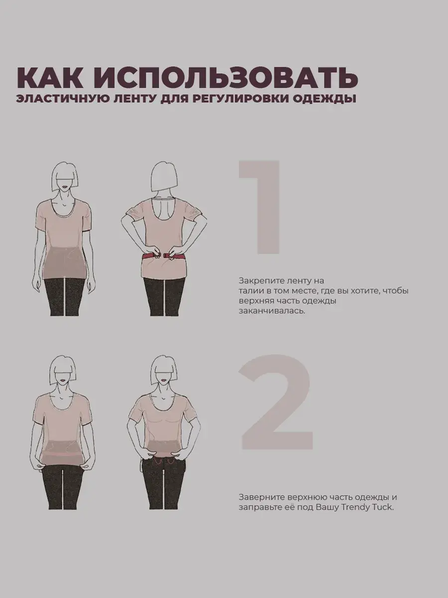 Как это работает? Просто закрепите Trendy Tuck на талии под вашей одеждой, затем аккуратно заправьте верхнюю часть под ленту, регулируя длину так, как вам удобно. Эта простая процедура позволяет одежде идеально облегать фигуру, подчеркивая вашу талию и создавая аккуратный силуэт.